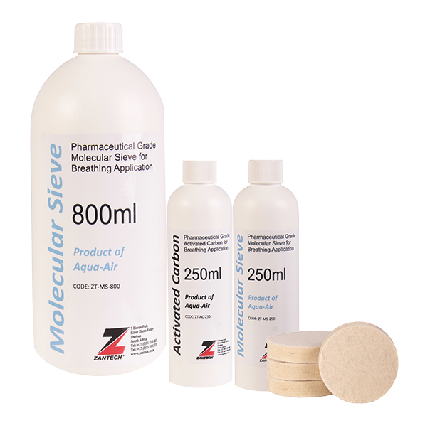 Pharmaceutical grade Molecular Sieve and Activated Carbon, bottled and hermetically sealed in aluminum foil with a shelf life guarantee of 24 months. Felts also included.